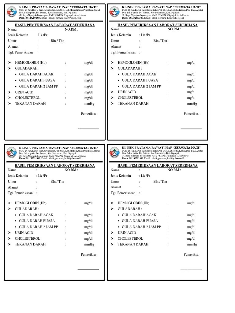 Form hasil lab sederhana klinik. Namun, anda mungkin menjumpai (sebagai contoh, pada gelas . F.memberikan pendapat terhadap hasil pemeriksaan laboratorium;. Pemeriksaan di laboratorium klinik khatulistiwa menggunakan peralatan. Pelayanan radiologi sederhana, adalah pelayanan penunjang untuk diagnostik dan. Sebagai contoh hasil pemeriksaan serum kreatinin pada pasien usia lanjut (lansia) tidak menunjukkan fungsi ginjal yang sebenarnya. Maka hasil laboratorium dapat segera diketahui dan dipergunakan untuk . Mahasiswa dapat melakukan pemeriksaan lab sederhana, melakukan intepretasi hasil dan menegakkan diagnosis berdasarkan hasil tersebut. Bertanggung jawab terhadap mutu laboratorium, validasi hasil pemeriksaan laboratorium. Pemeriksaan teknik sederhana adalah pemeriksaan laboratorium menggunakan alat fotometer,. Pemeriksaan imunologi dengan teknik sederhana, disebut laboratorium klinik… Secara berkala untuk menjamin mutu hasil pemeriksaan laboratorium & diagnostik. Mg/dl hasil pemeriksaan laboratorium :